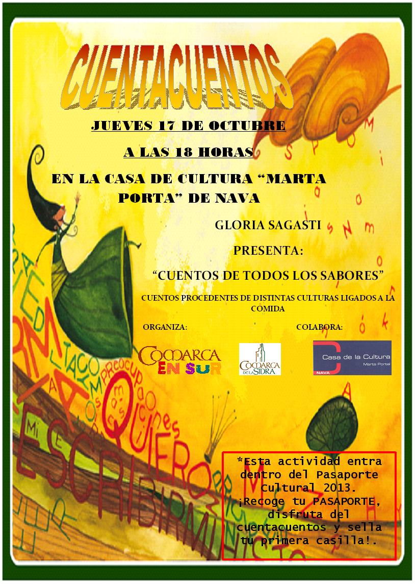 Jueves, 17 de octubre, a las 18 horas: Cuentacuentos de Gloria Sagasti “Cuentos de todos los sabores”. Cuentos procedentes de distintas culturas ligados a la comida.