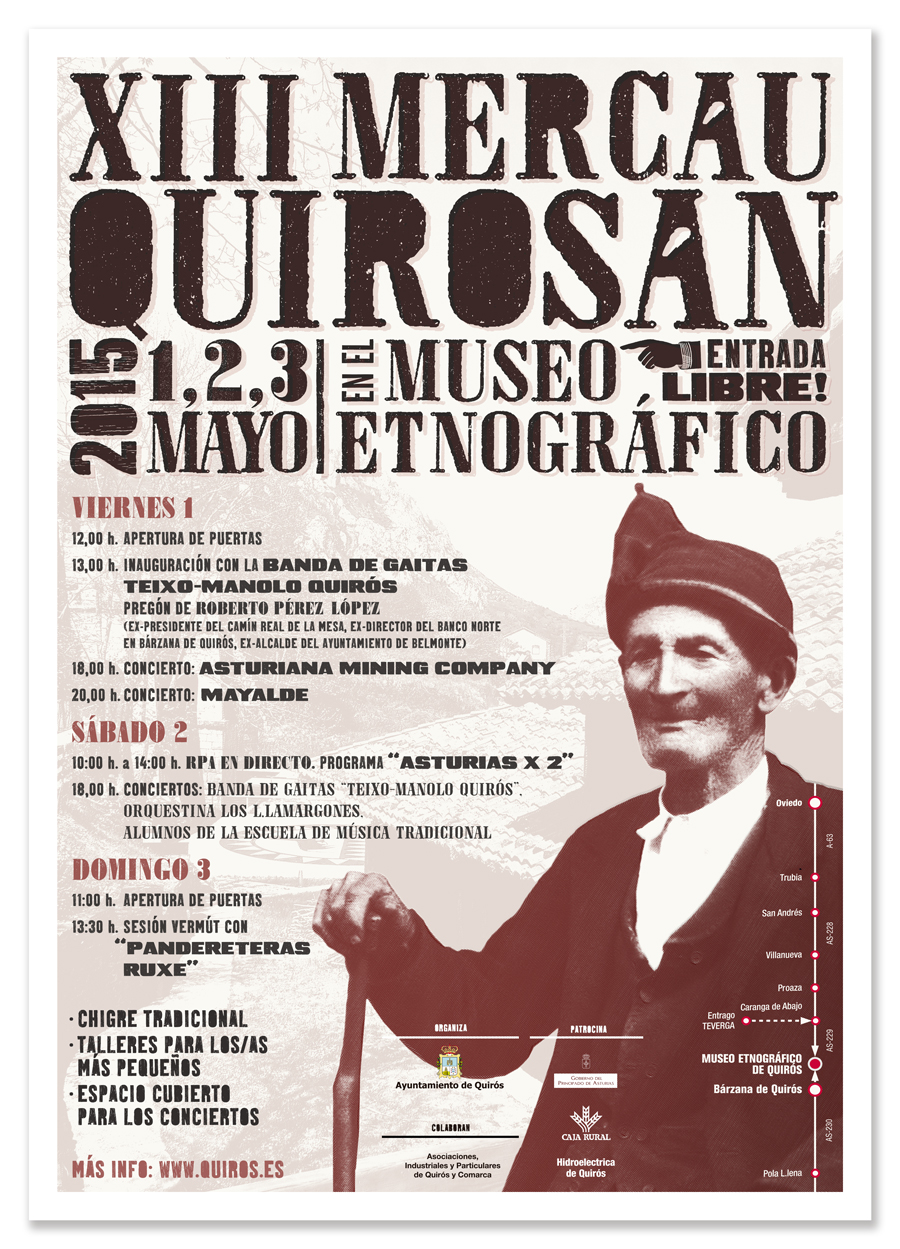 Los días 1, 2 y 3 de Mayo se celebra el XIII MERCÁU QUIROSÁN 2015, en el Museo Etnográfico de Quirós a menos de un km de la capital quirosana, se convertirá en el escenario de un mercado ambientado en el estilo tradicional asturiano, donde se darán cita diversos puestos con todo tipo de productos artesanales y agroalimentarios, se realizarán demostraciones de oficios tradicionales y talleres para los/as más pequeños/as.
